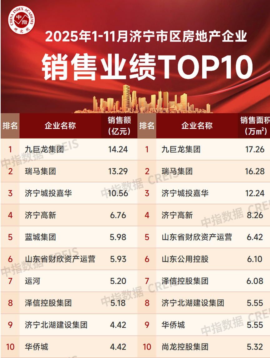 济宁市城区2025年1-11月房企销售业绩TOP10