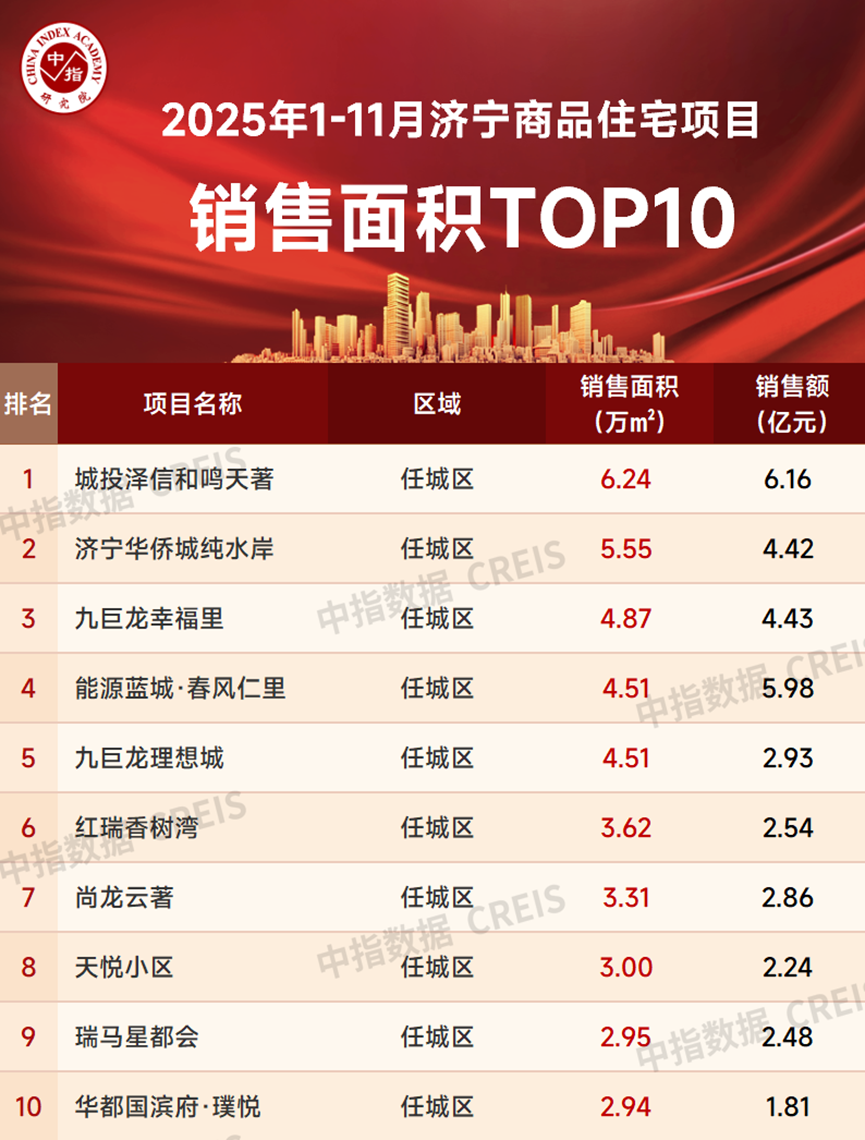 数据声明:房地产企业销售数据统计是以2025年1-11月销售的商品住宅为统计口径,项目销售数据以商品住宅为统计口径,主要依据中指研究院在济宁市市区(不包括县、市)的销售监测数据,并同时参考企业提供的相关数据,对少数没有在监测范围内的项目,由企业提供相关文件,经审核,也纳入统计范围,集中网签的已售罄项目不纳入榜单。本榜单仅供参考,课题组不对使用榜单及其内容所引发的任何直接或间接损失承担责任。